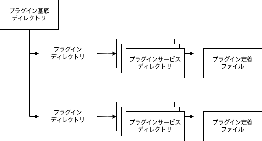 起動オプションの--plugins_base_dirsで指定し、指定したディレクトリを基準にそれぞれのディレクトリ、ファイルをプラグインディレクトリ、プラグインサービスディレクトリ、プラグイン定義ファイルとして読み込みます。