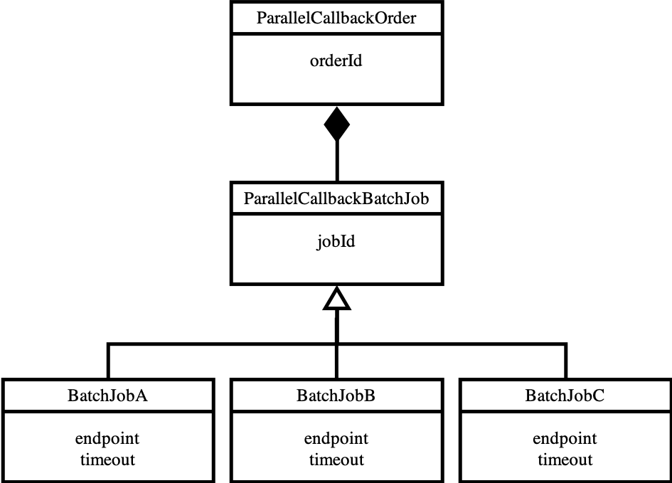 各マイクロサービスへのリクエスト状態を管理するのは、ParallelCallbackBatchJobです。識別子としてjobIdを保持します。ParallelCallbackOrderは、各マイクロサービスへの呼び出し状態を管理するためにParallelCallbackBatchJobをリストで保持します。