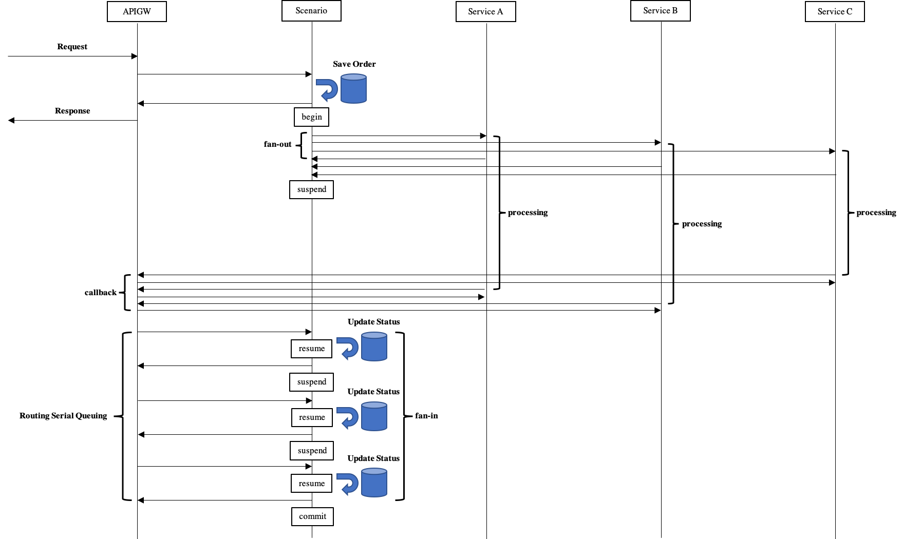 シナリオで複数のマイクロサービスを並列に非同期に呼び出し、各マイクロサービスからのAPIコールバックを待ち合わせて処理を再開するには、serveコマンドを利用します。Docs » チュートリアル » Compound Transactionでは、サブシナリオからのAPIコールバックを例に記載していますが、複数のAPIコールバックを待ち合わせる点において留意点が異なります。