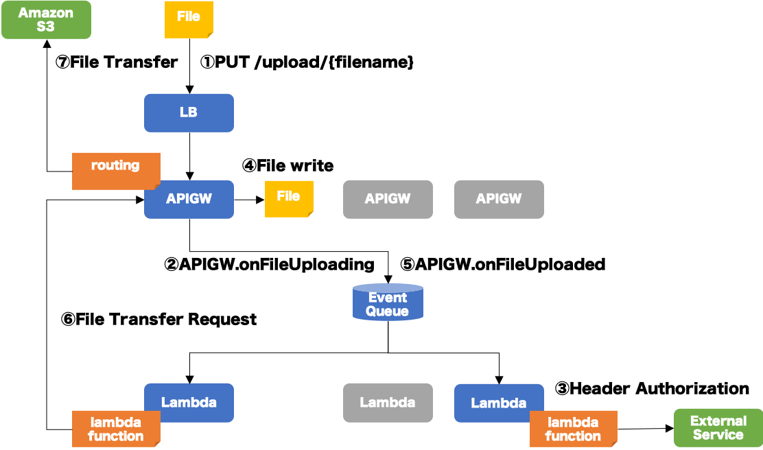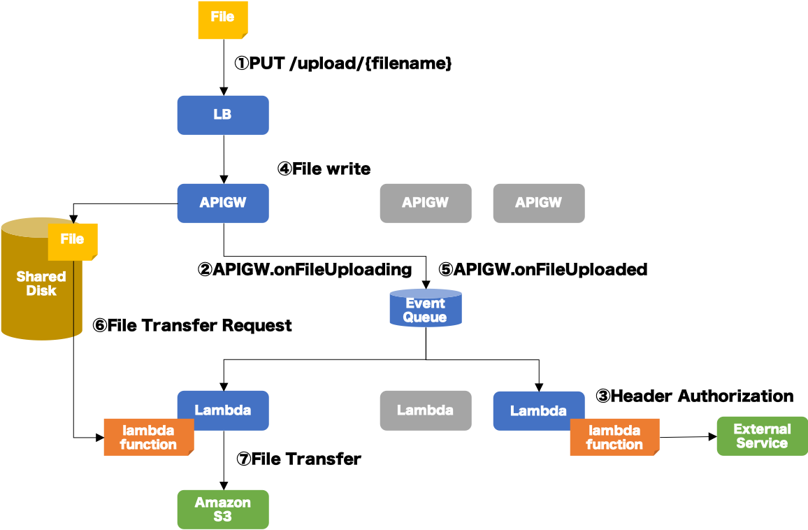 APIGWのローカルディスクにファイルを保存した場合の例を紹介しましたが、APIGWとLambdaで共有ディスクをマウントしている場合は、APIGW.OnFileUploadedのイベントハンドラの中でファイル転送することができます。