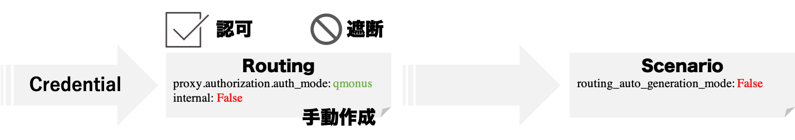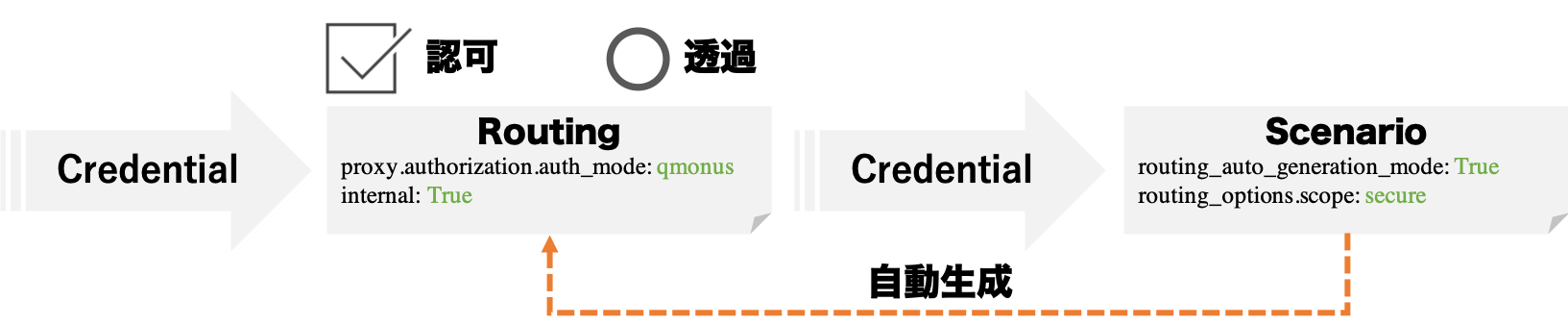 routingを手動で作成する場合、qmonus認可を有効化してinternalをFalseに設定するとクレデンシャルが透過されないルーティングとなります。この場合はScenario側でQmonusアカウントを特定することはできません。
