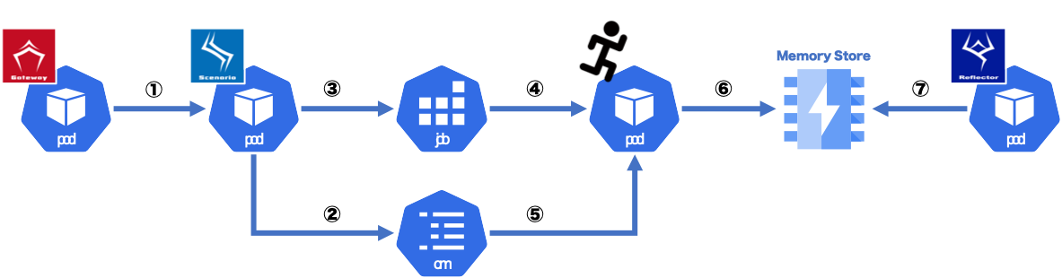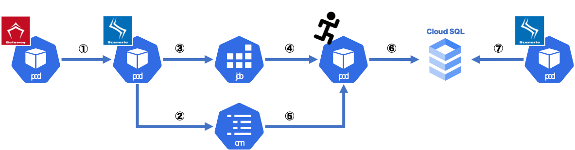 具体的には、Kubernetes Jobを生成してSDK Runnerを起動して実行します。SDK Runnerとは、Qmonus SDKで動作するScenarioやATOMなどのプラグイン、各種組込みオブジェクトを用いたスクリプトを単体実行するRunnerモードで起動されたSDKです。