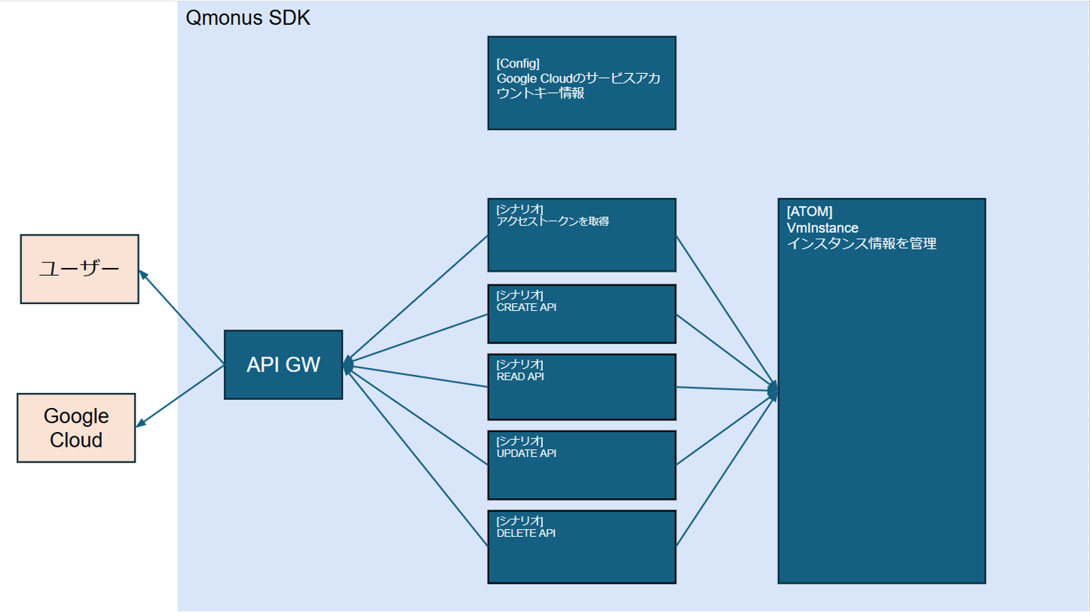 ATOMには、ComputeEngineのインスタンスが持つ情報(projectId, zone, machineType, sourceImage, network)とインスタンスのステータスを保存するようにし、Qmonus SDK上でリソースの管理を行います。