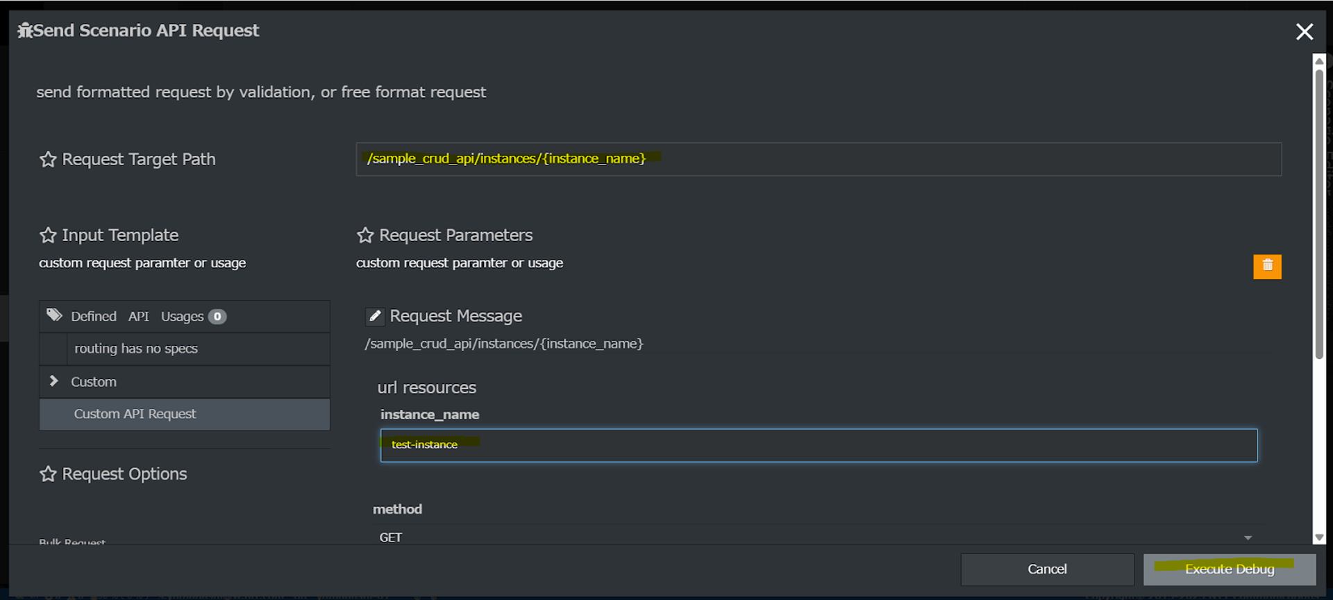READ | 指定したインスタンス情報を取得する | /sample_crud_api/instances/{instance_name} | GET | - | 200 OK, {“instances”: [*]} |