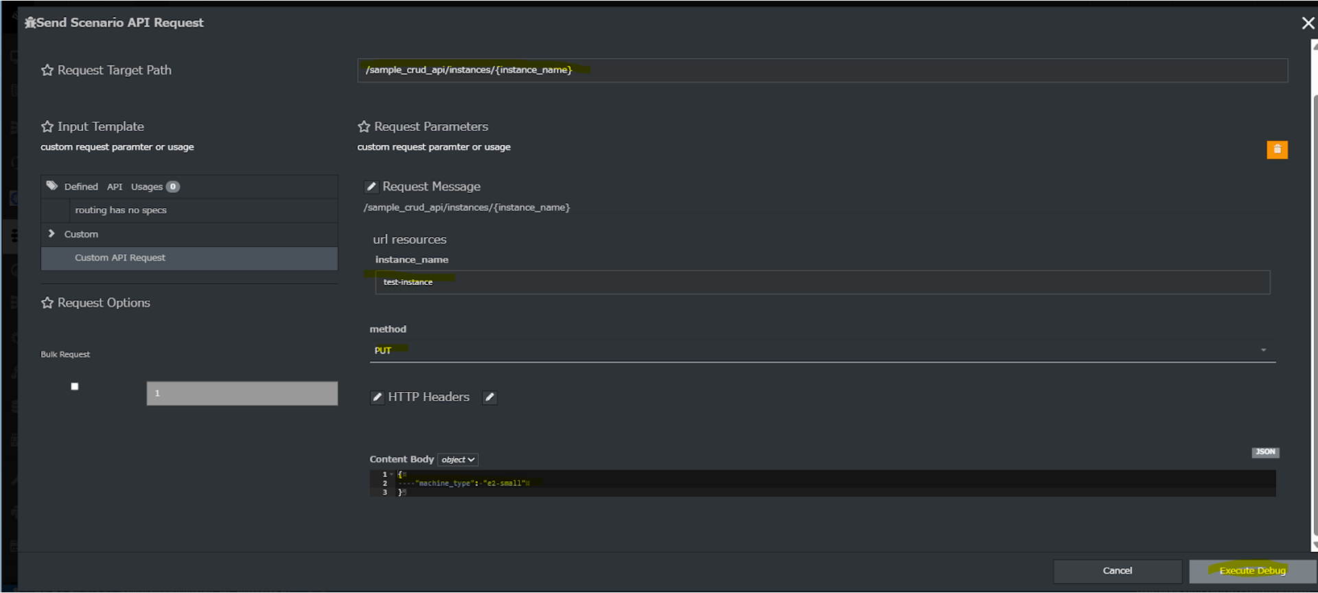 UPDATE | 該当のComputeEngineインスタンスのマシンタイプを更新する | /sample_crud_api/instances/{instance_name} | PUT | {“machineType”: “xxxxxxx”} | 200 OK |
