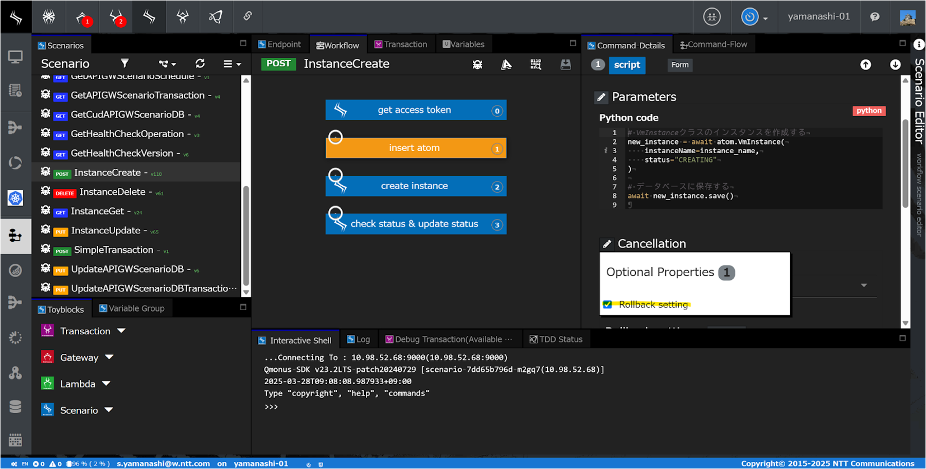 このテストケースはCREATE APIが途中で失敗し、ロールバックとなる場合のテストになります。そのため、最終的にトランザクションのステータスがロールバックが正常に完了した場合のステータスであるCancelledであるかどうかを確認します。