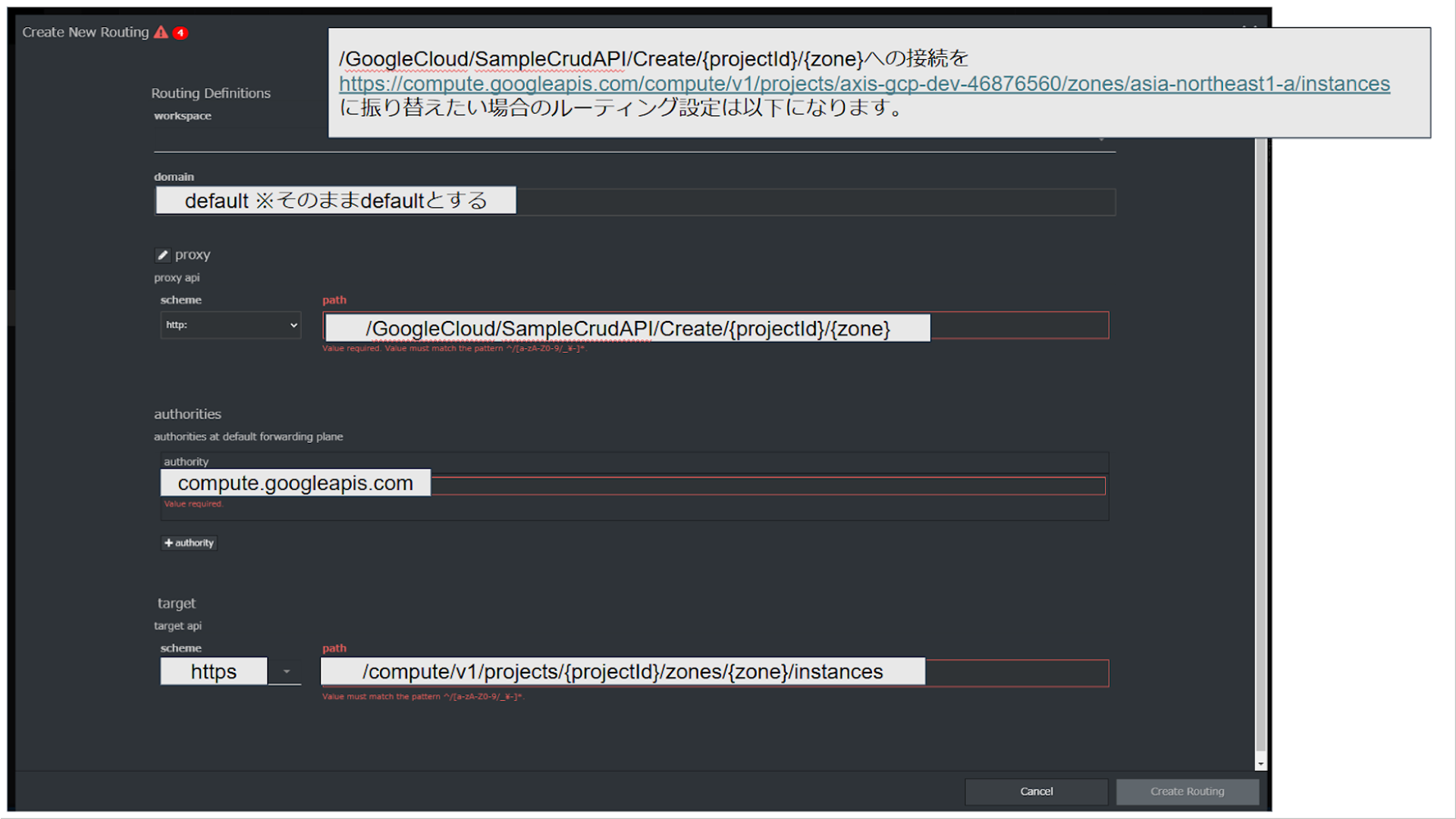 ルーティングを行うことで、各シナリオでCompute Engine APIを実行した際に、一度APIGWを経由してGoogle Cloudに飛んでいくようにします。